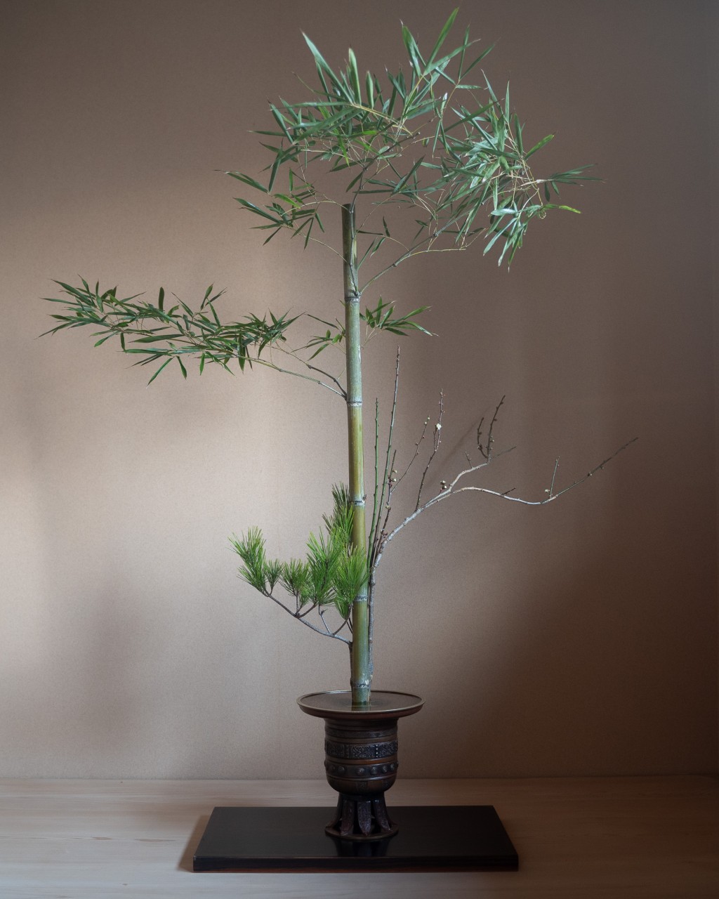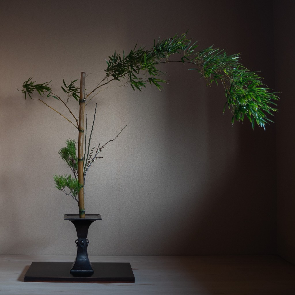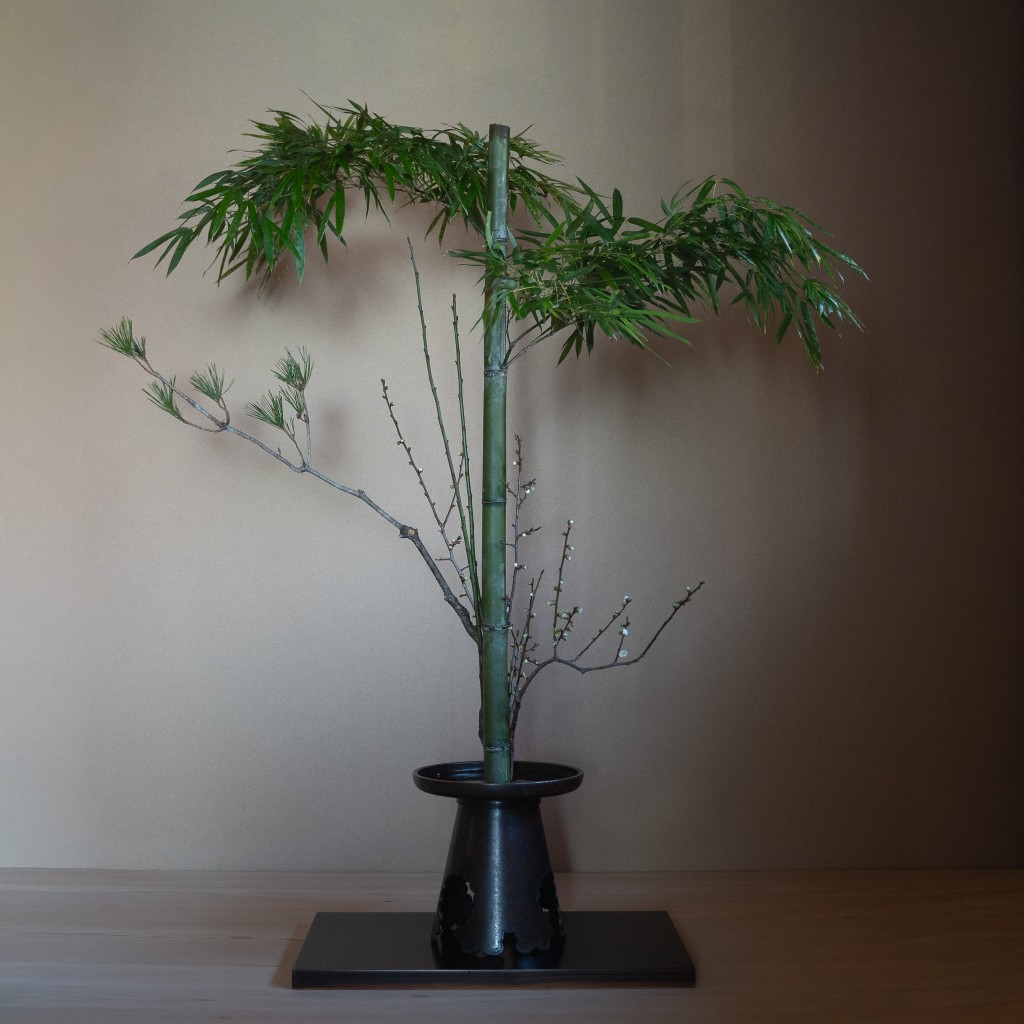 松竹梅という古くから伝わる特殊な生花を稽古しました。伝統的な生花では通常1種類または2種類の植物を用いることになっていますが、このは例外で昔からめでたいものの代表とされる松、竹、梅の3種類を組み合わせていけます。3種類をどこにどのように配置するかは決まりがなく、それぞれの枝の個性を捉えて適材適所に配置します。そのためそれぞれに全く違った生花ができあがります。